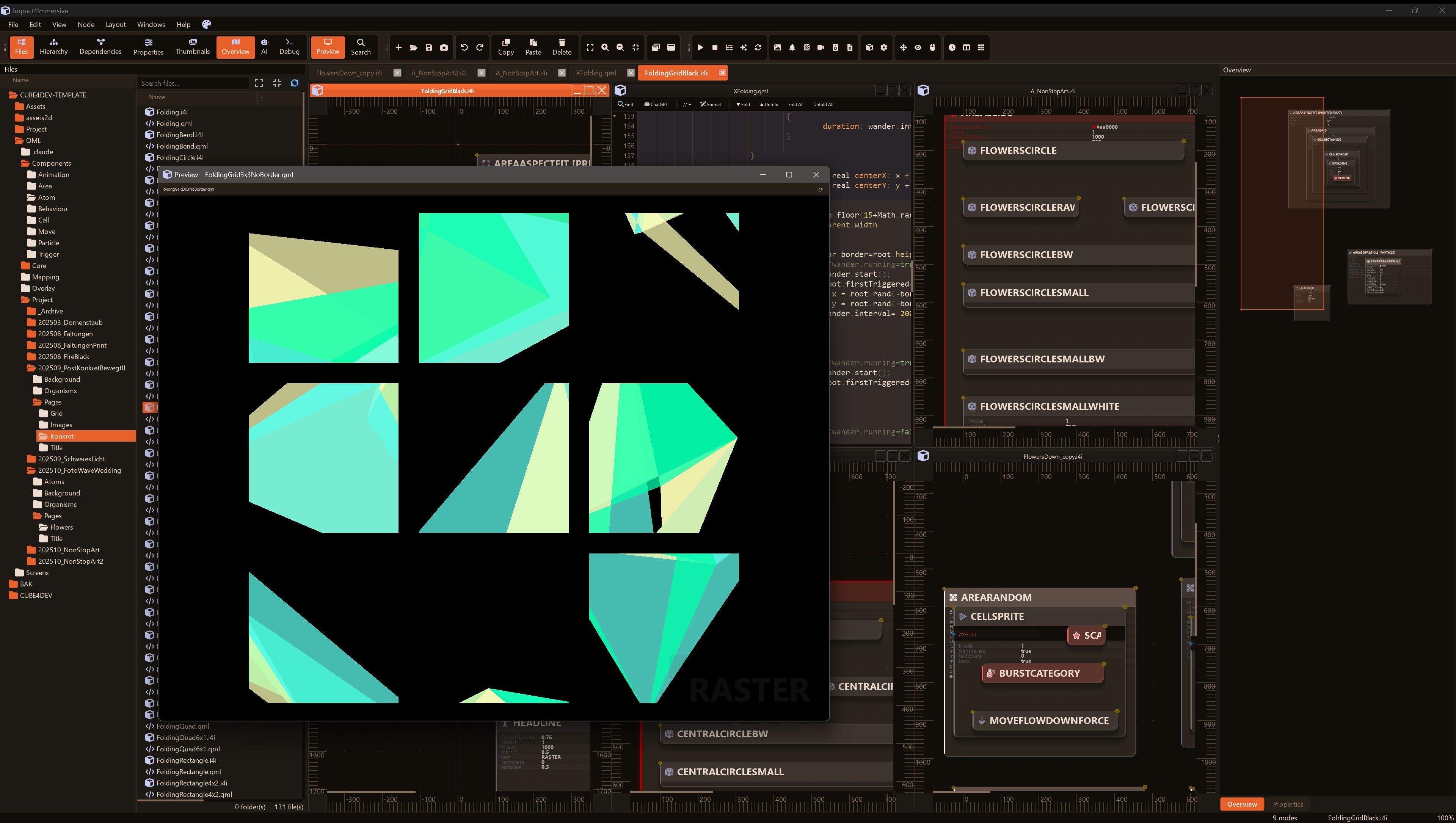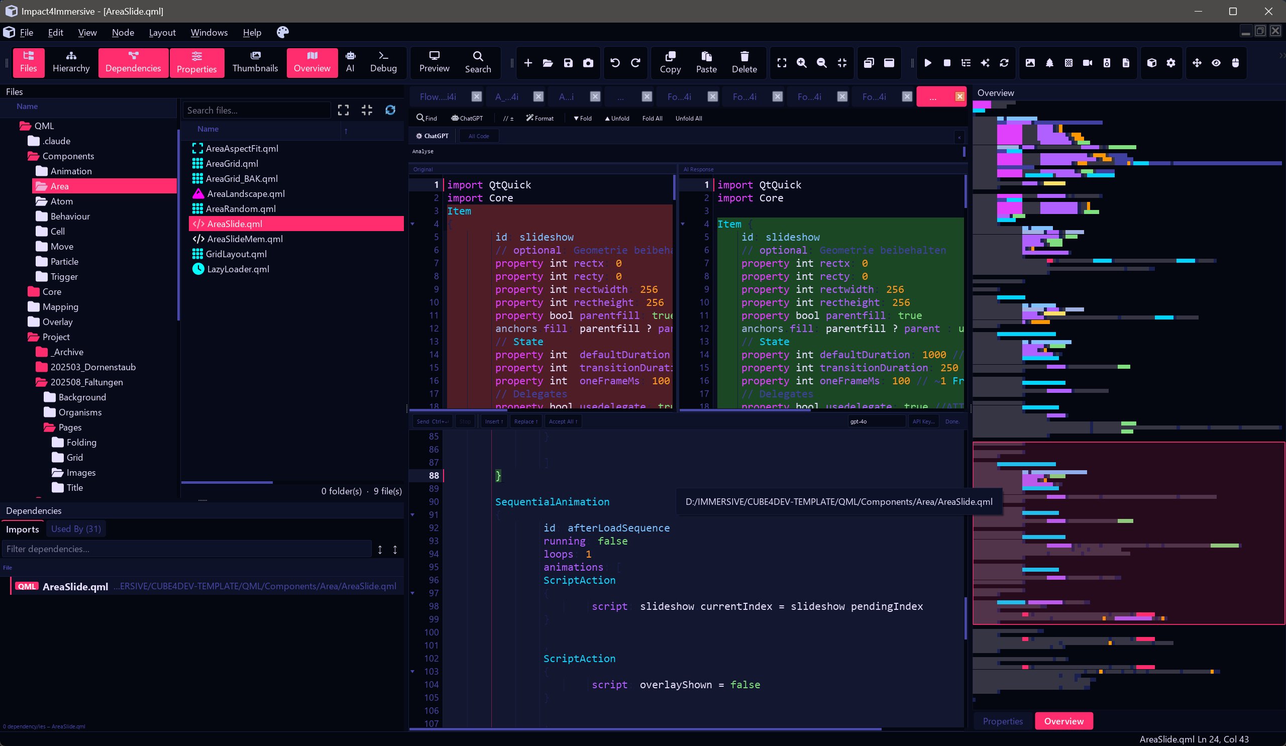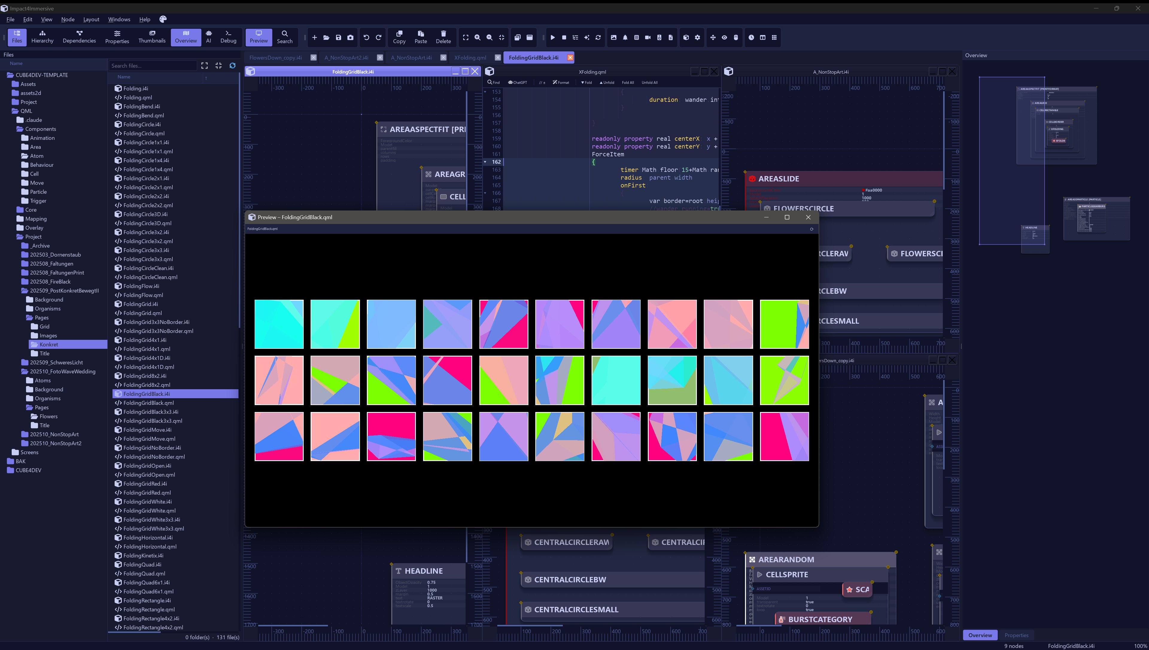 Diese Entwicklungsumgebung ist für die Entwicklung und Produktion immersiver Kunstinstallationen ausgelegt. Grundlage sind C++, Qt und QML. Das System vereint textbasierte Programmierung mit visueller Szenen- und Verhaltenskomposition und richtet sich an künstlerische Softwareprojekte, in denen Bild, Raum, Licht, Bewegung und Interaktion als zusammenhängende Struktur entstehen.