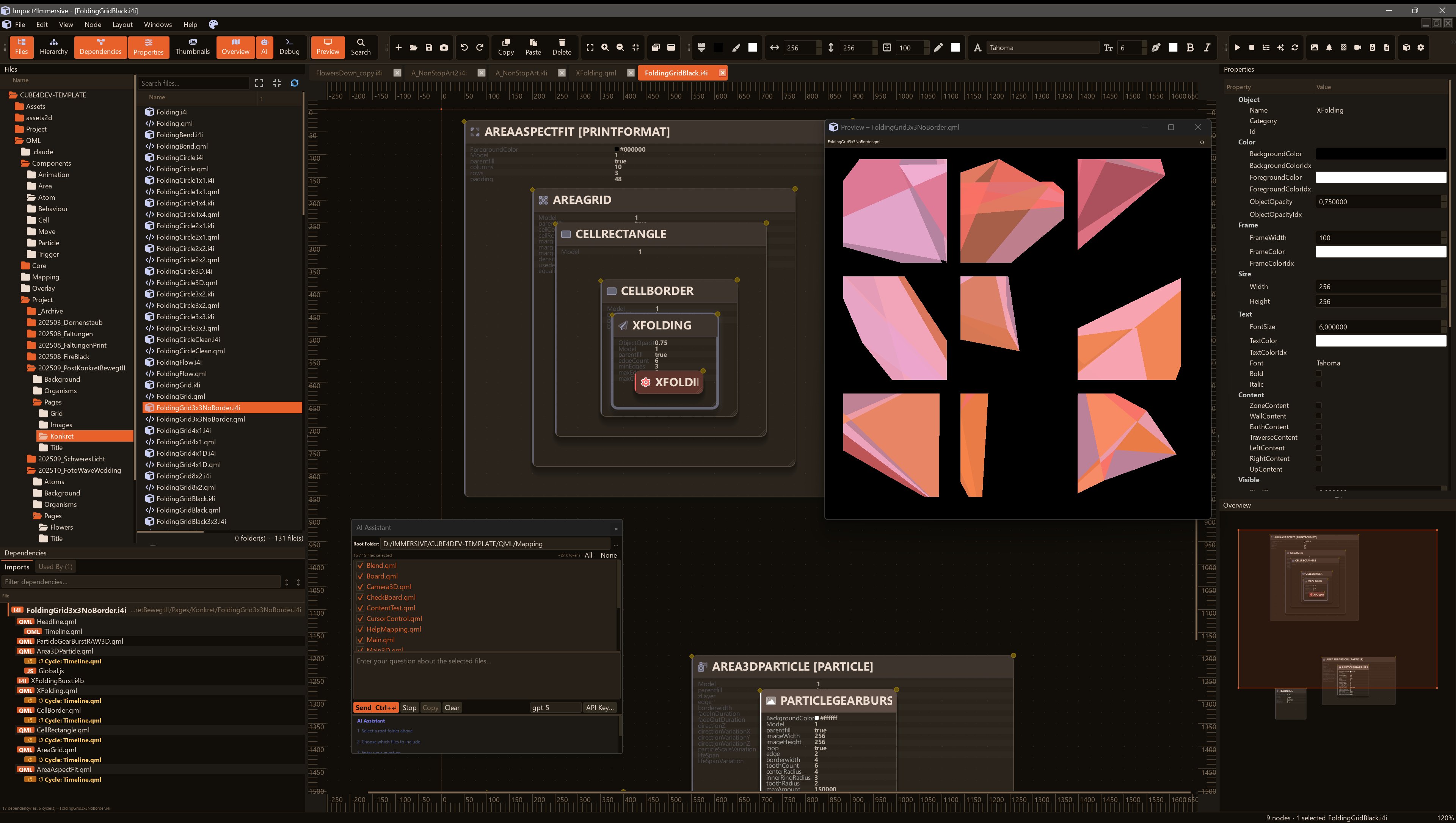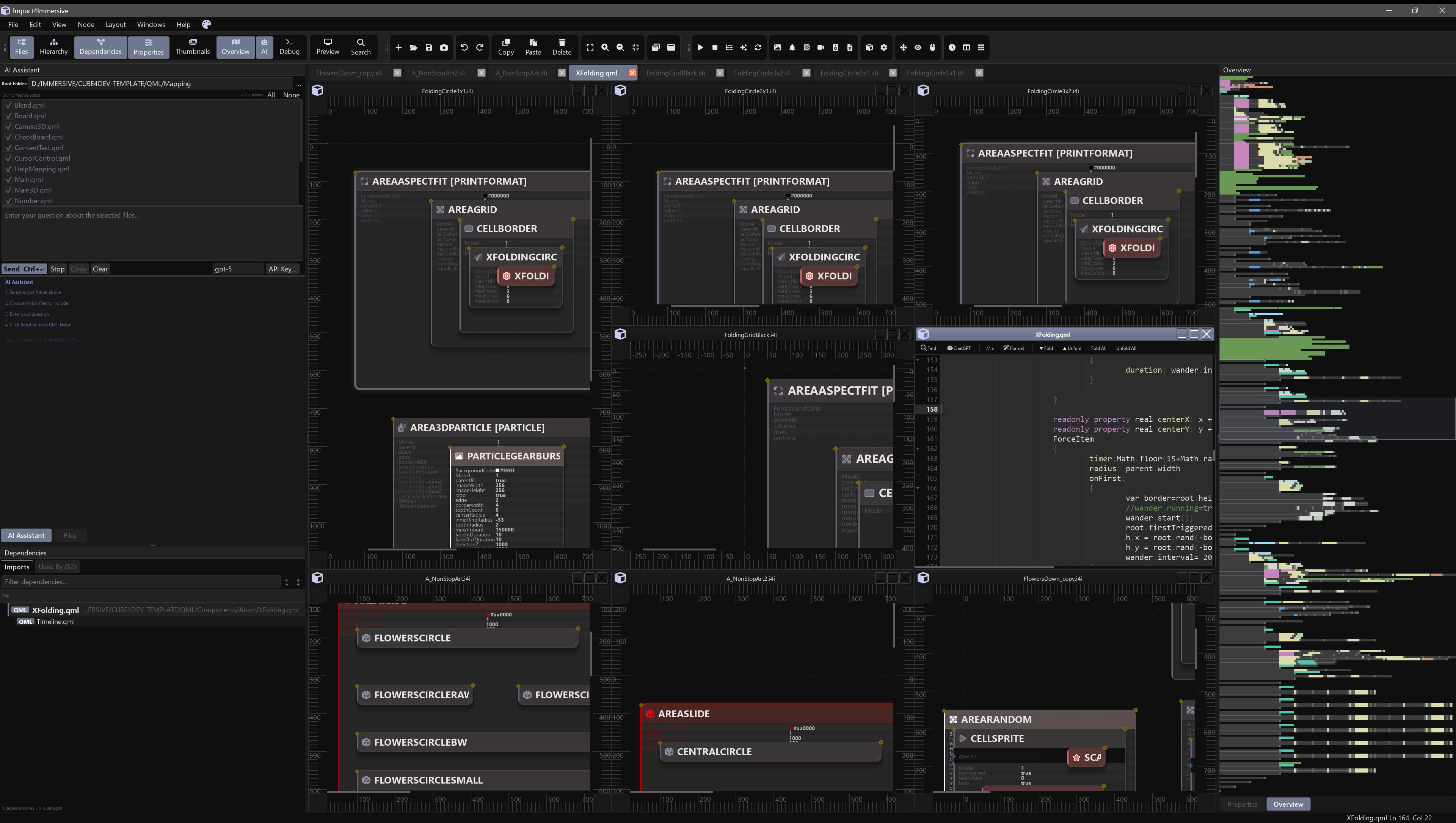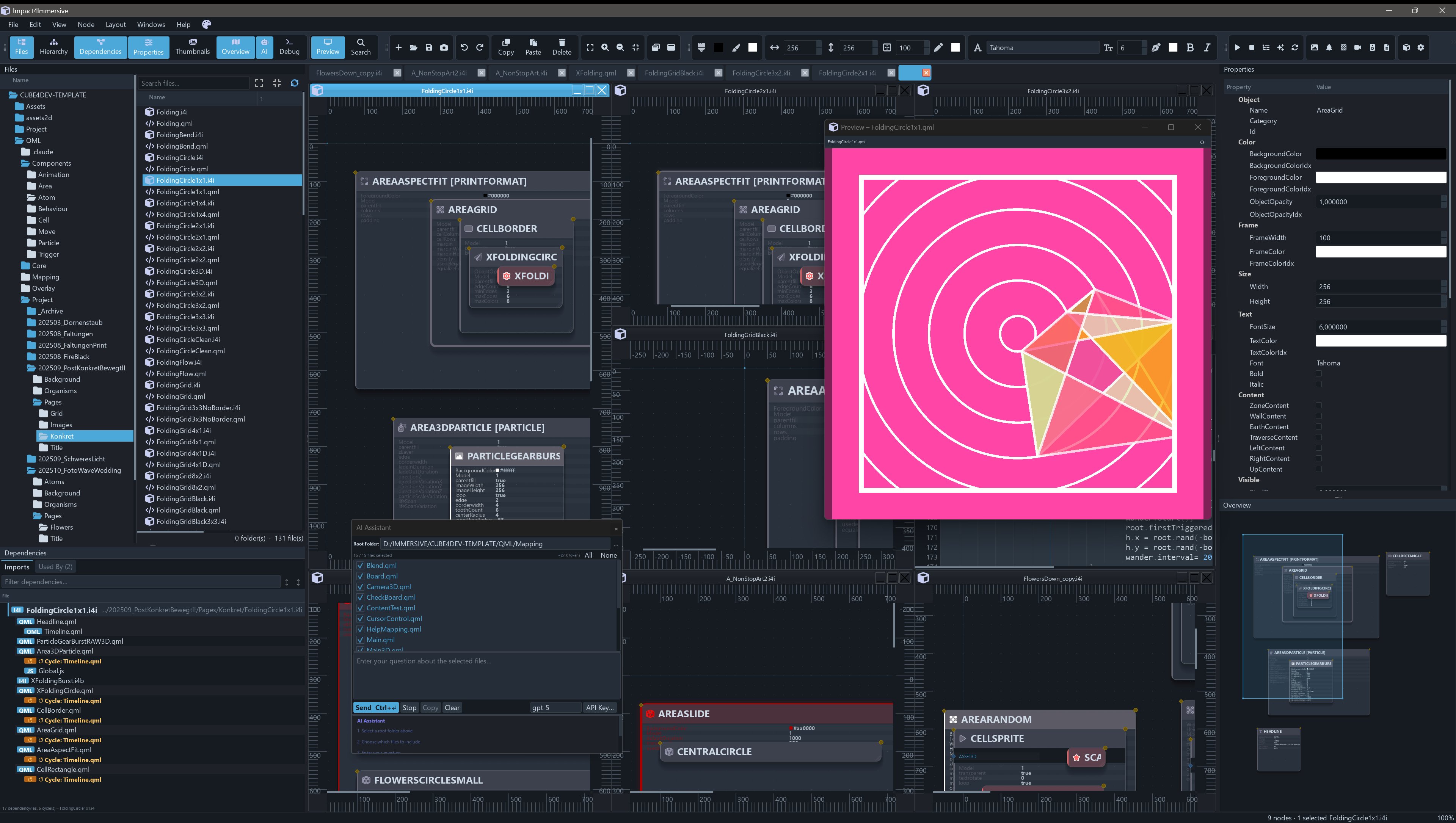 Diese Entwicklungsumgebung ist für die Entwicklung und Produktion immersiver Kunstinstallationen ausgelegt. Grundlage sind C++, Qt und QML. Das System vereint textbasierte Programmierung mit visueller Szenen- und Verhaltenskomposition und richtet sich an künstlerische Softwareprojekte, in denen Bild, Raum, Licht, Bewegung und Interaktion als zusammenhängende Struktur entstehen.